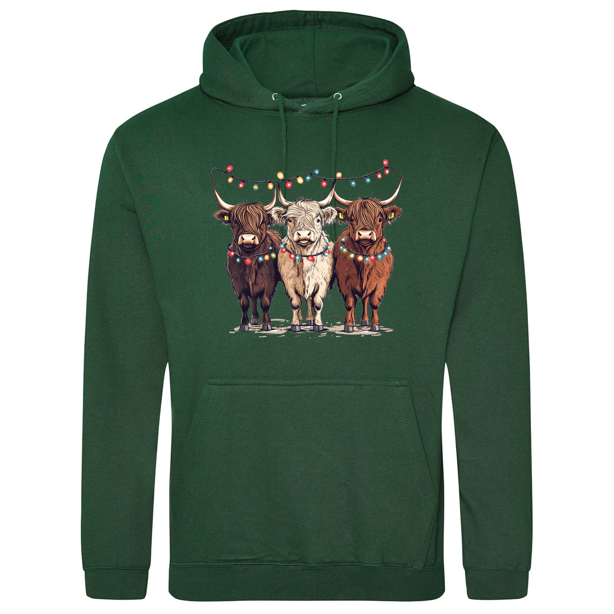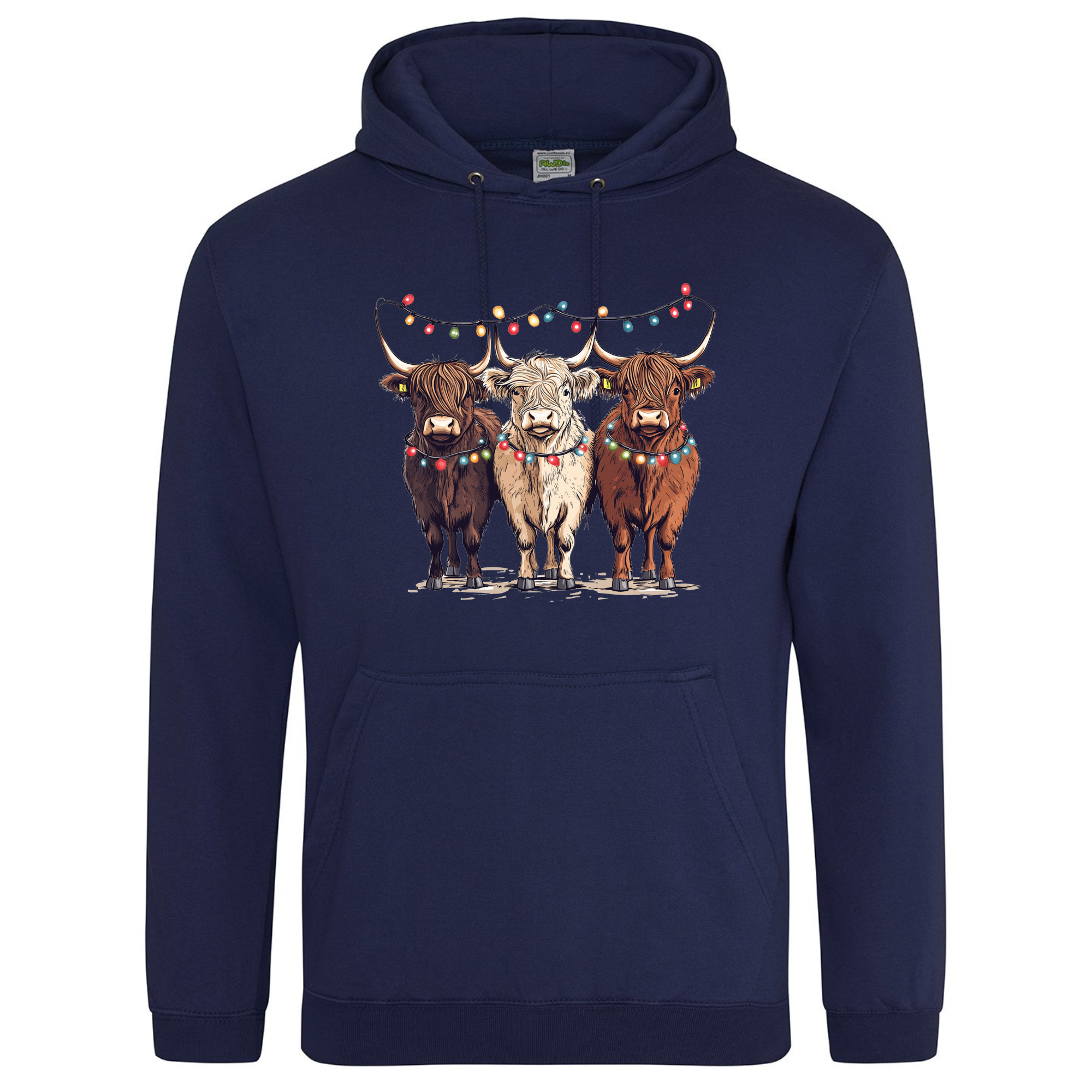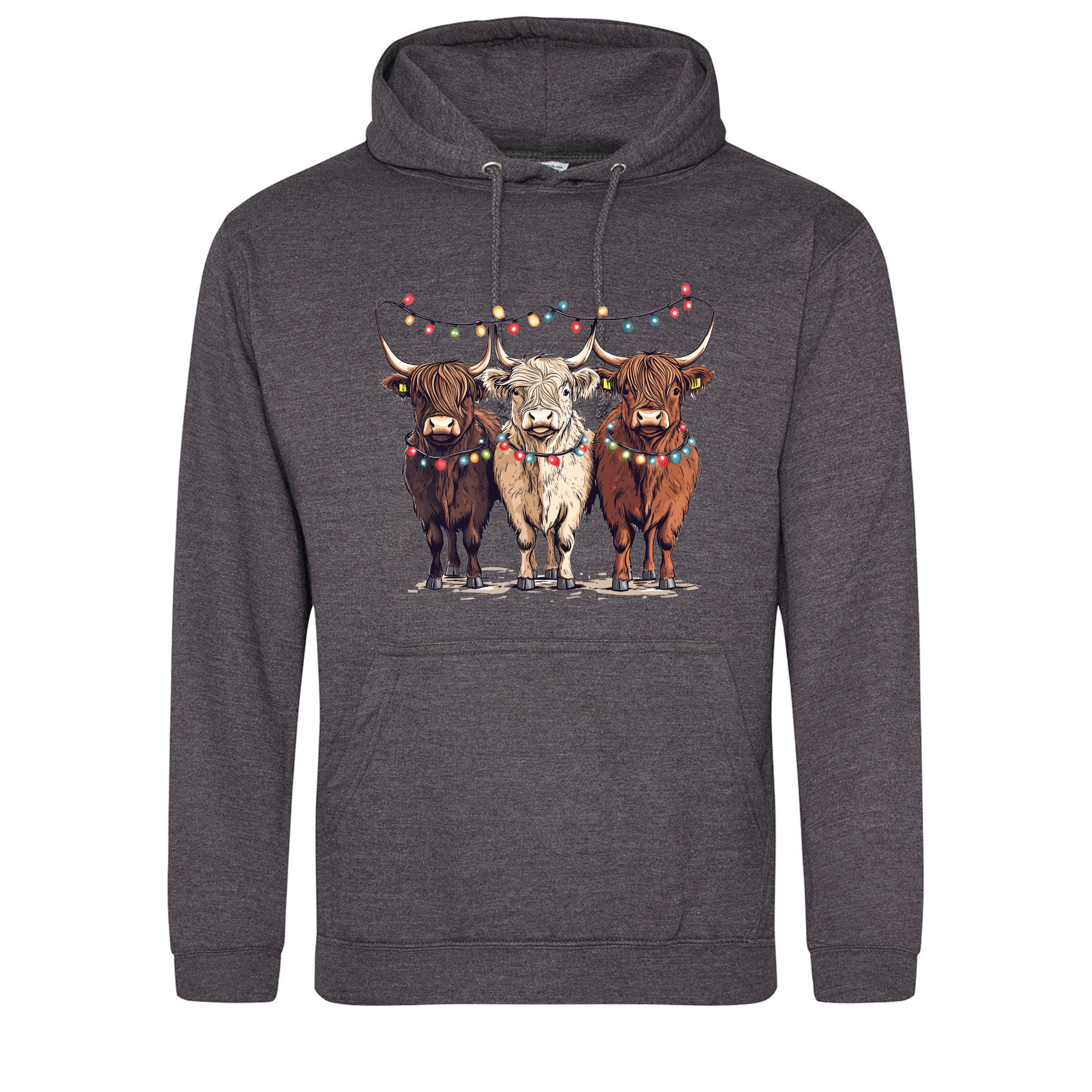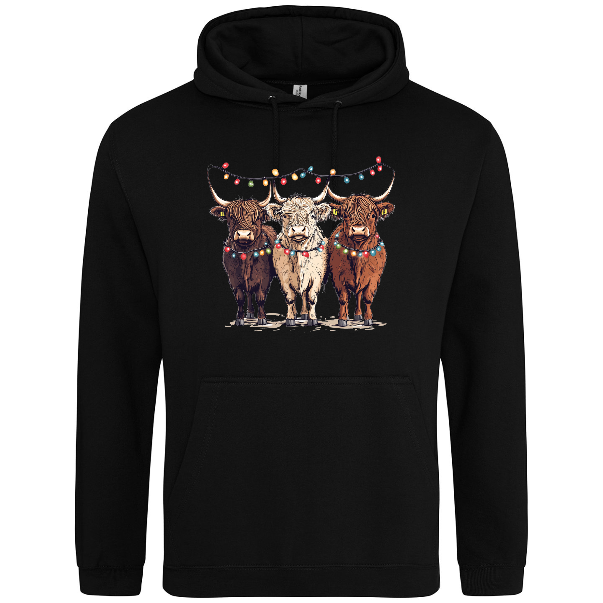 Bring a smile to your festive season with our Christmas Cows Hoodie — featuring three adorable Highland cows all dressed up in their Christmas best, complete with fairy lights and festive charm. 🐮✨