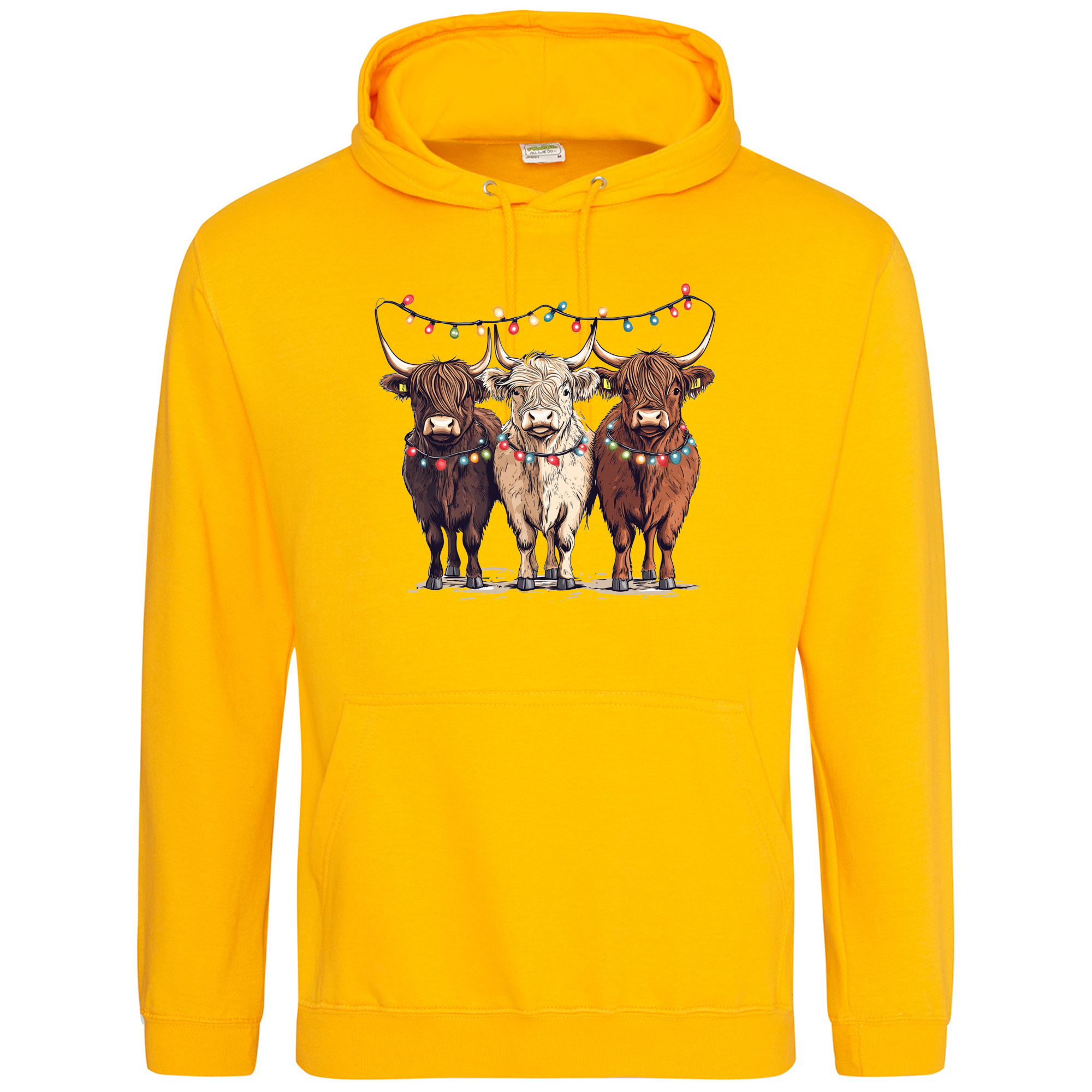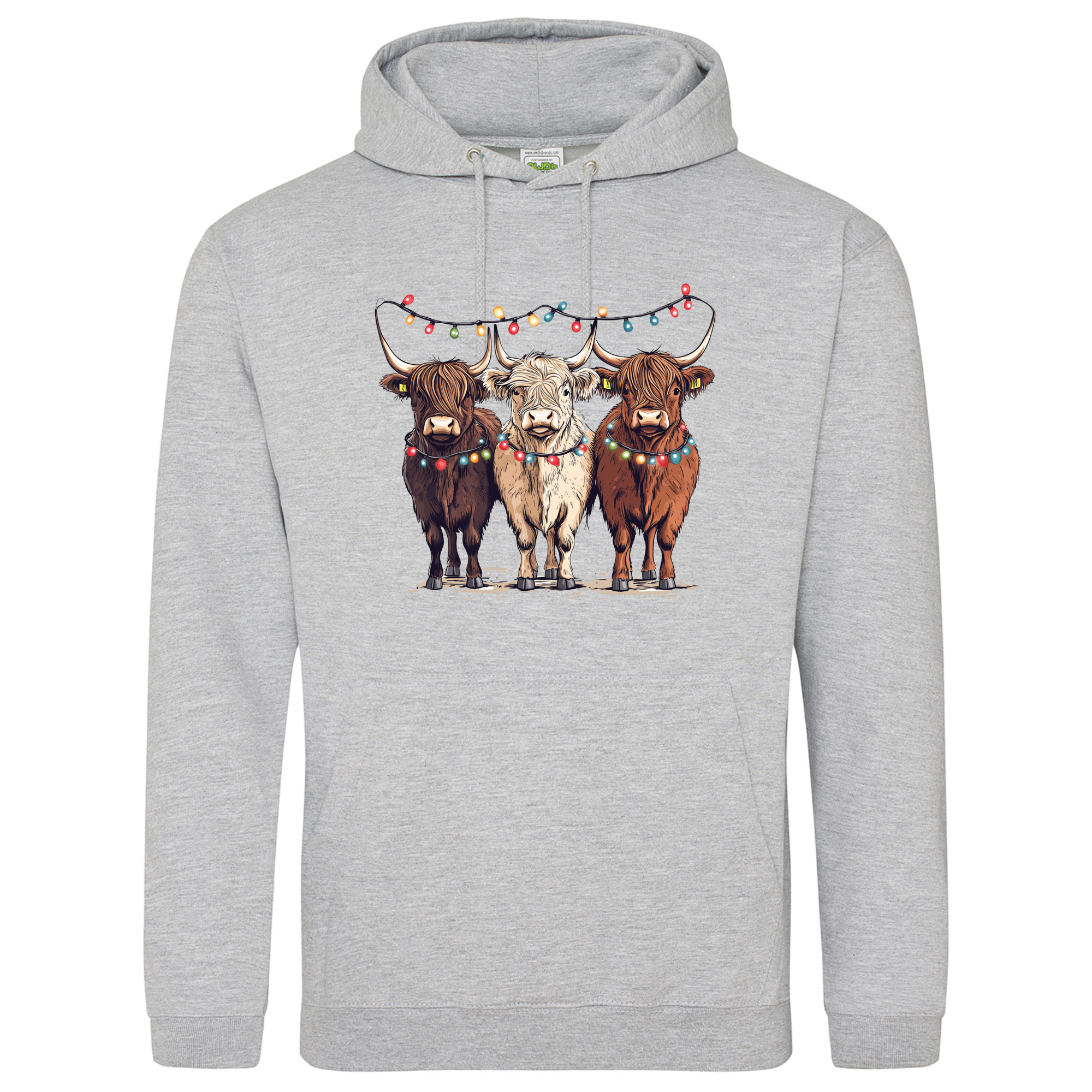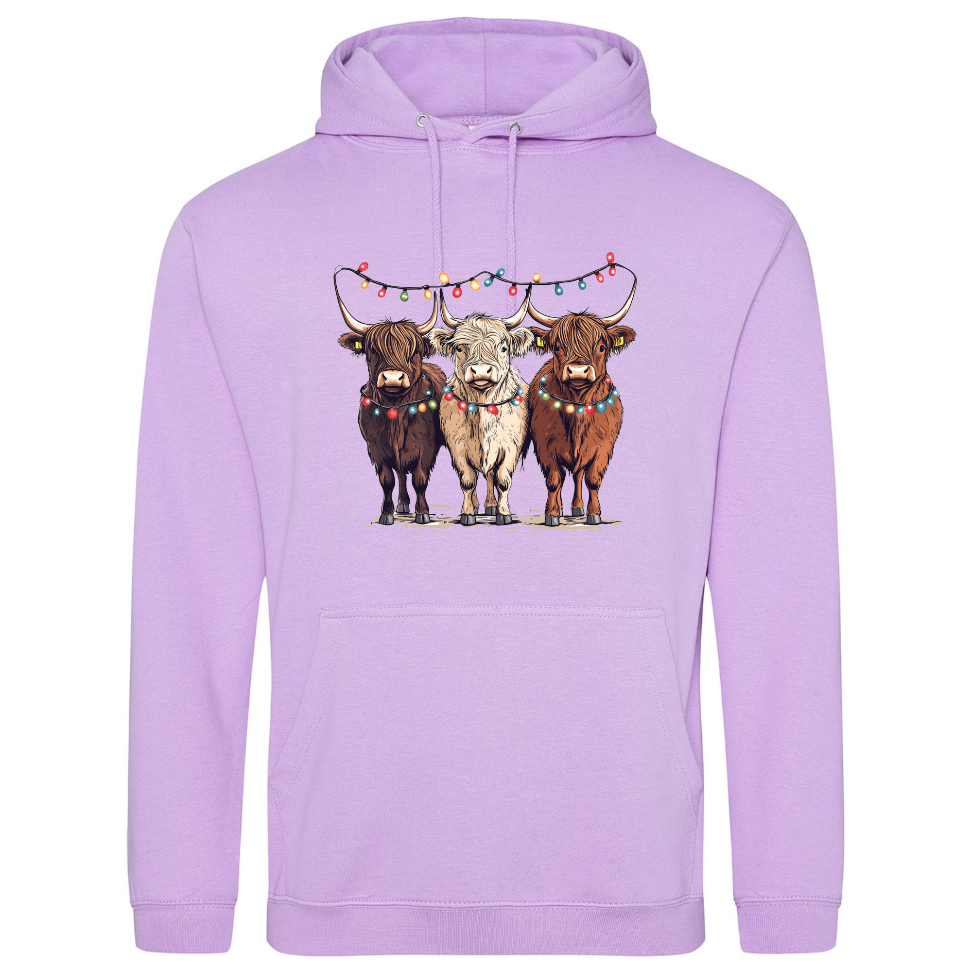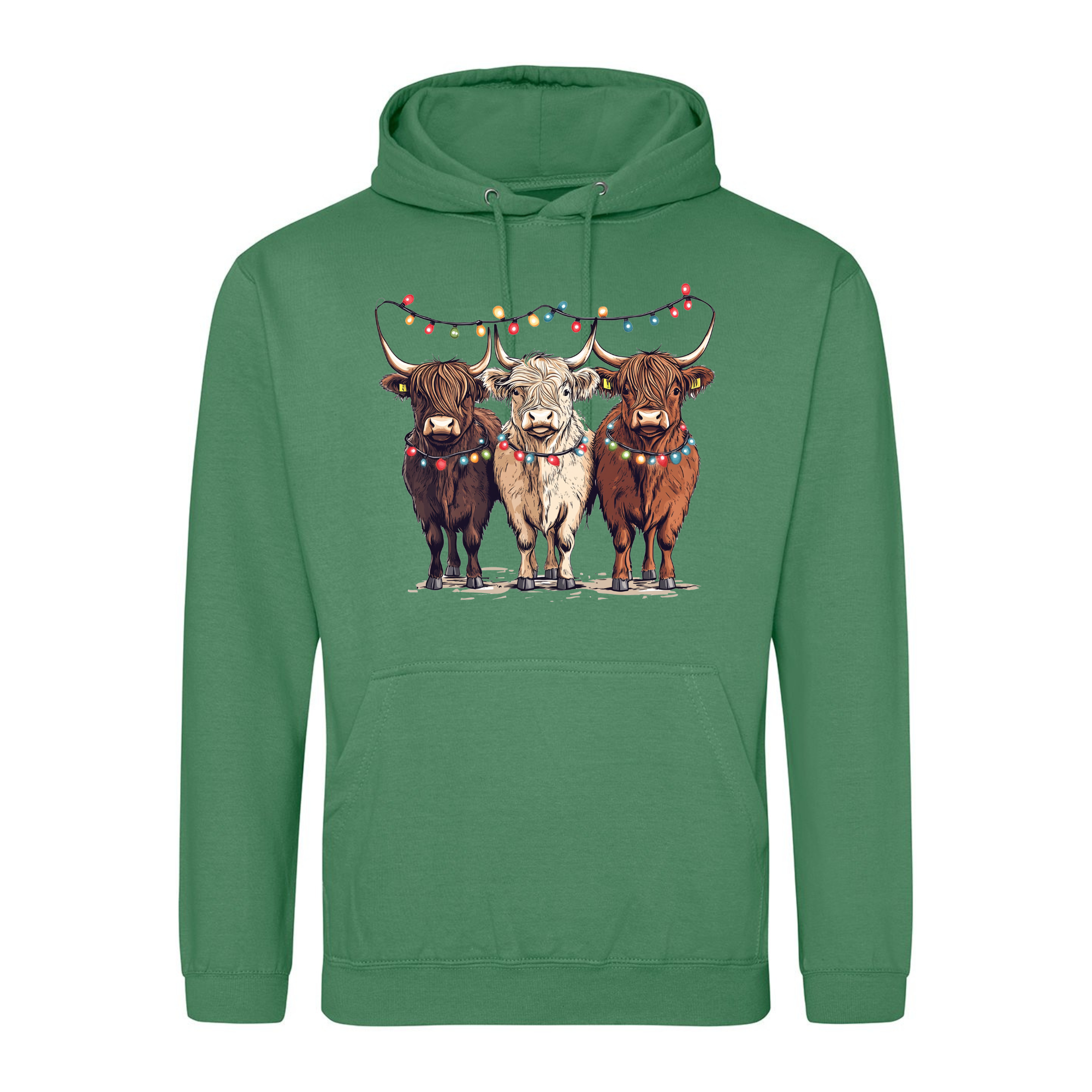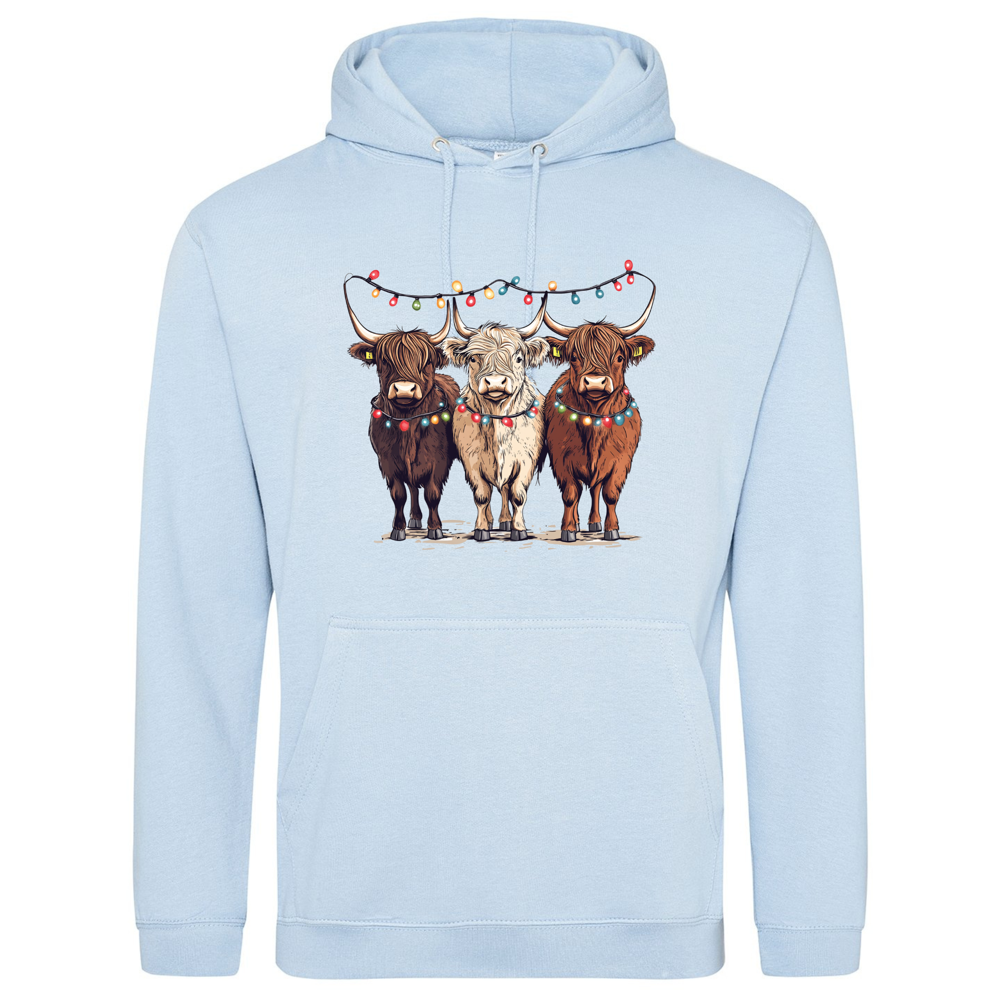 Bring a smile to your festive season with our Christmas Cows Hoodie — featuring three adorable Highland cows all dressed up in their Christmas best, complete with fairy lights and festive charm. 🐮✨